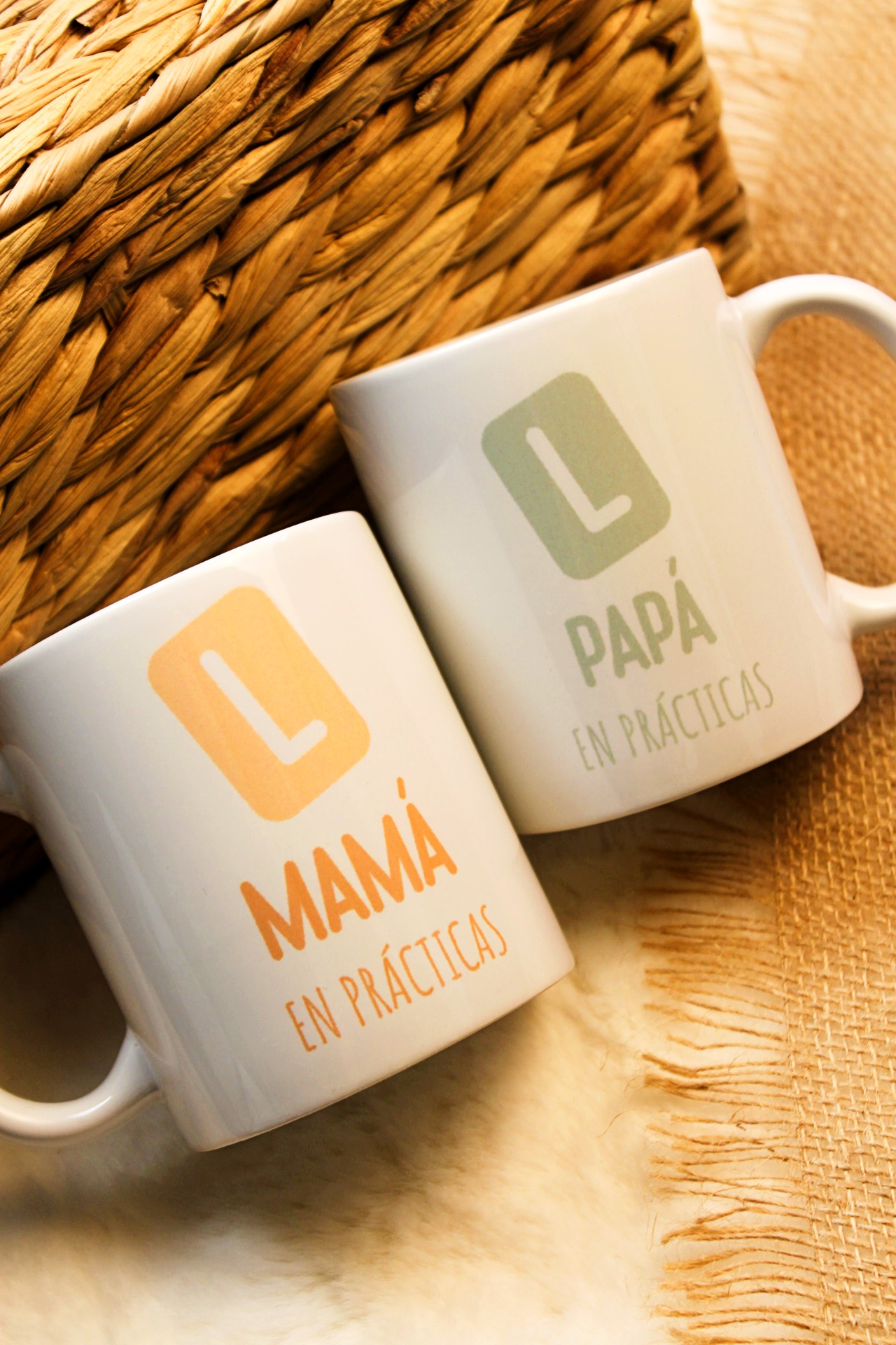 Este pack incluye un body divertido con la L en prácticas y el mensaje “Papás/Abuelos en prácticas”, junto con dos tazas a juego, una para papá o el abuelo y otra para mamá o la abuela.