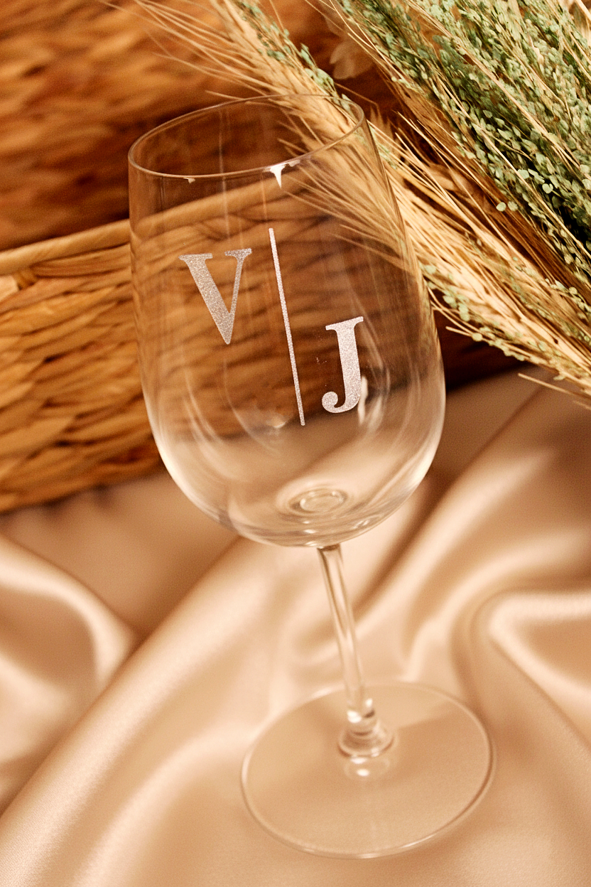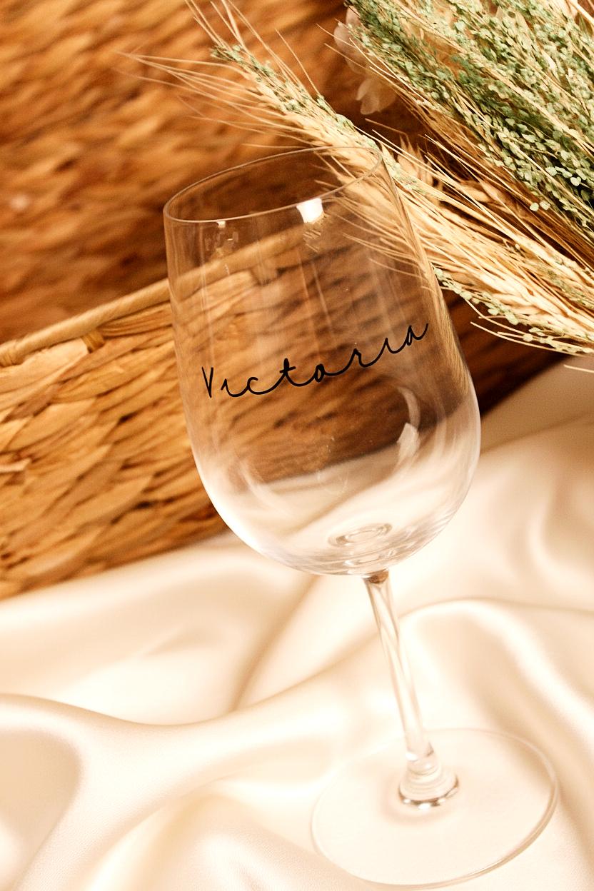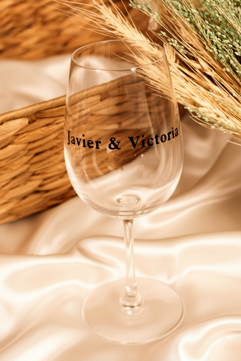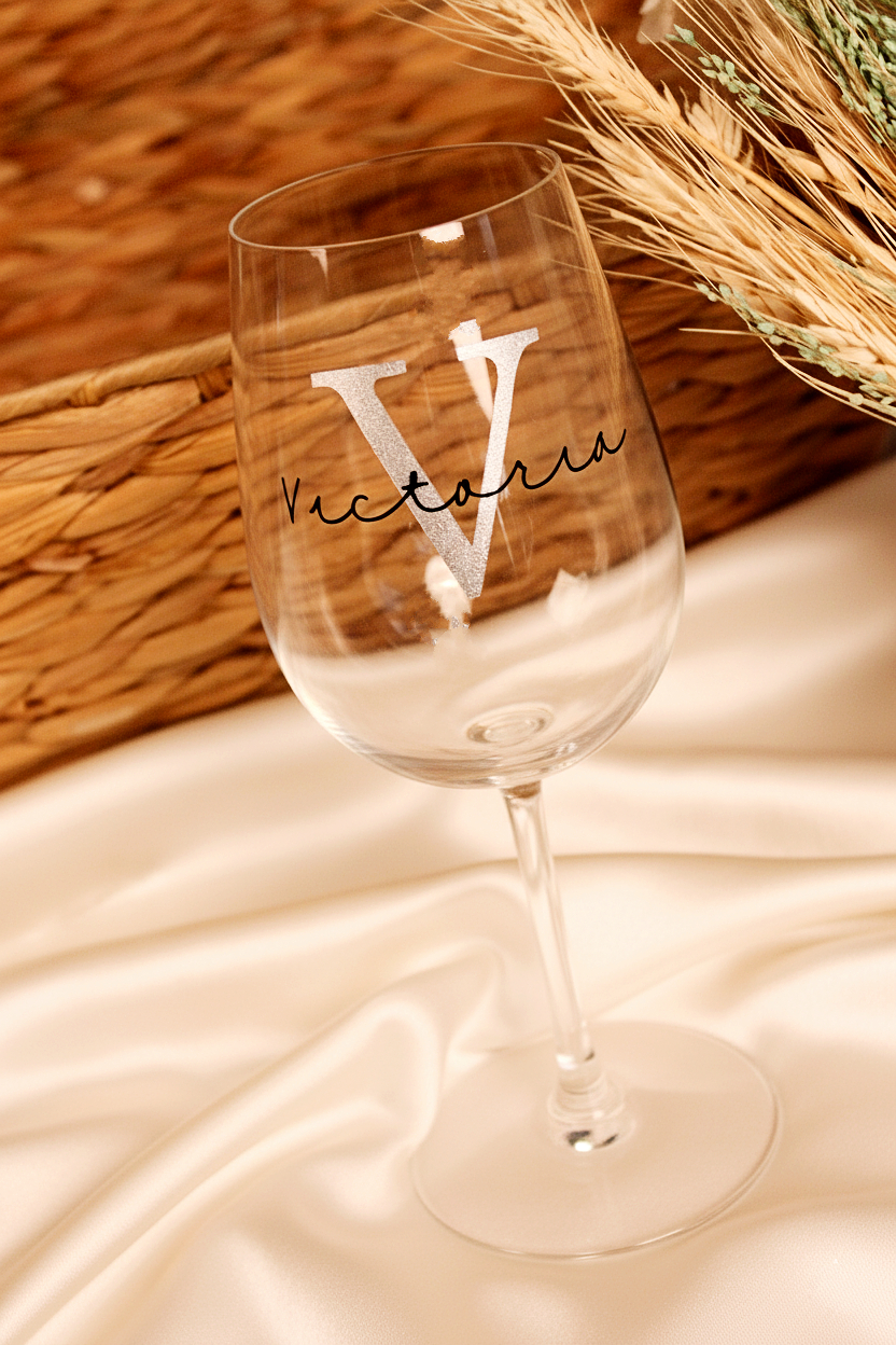 Nuestra copa de vino personalizada se puede diseñar a tu gusto, eligiendo entre cuatro estilos diferentes: inicial y nombre, iniciales, nombre básico, y más.