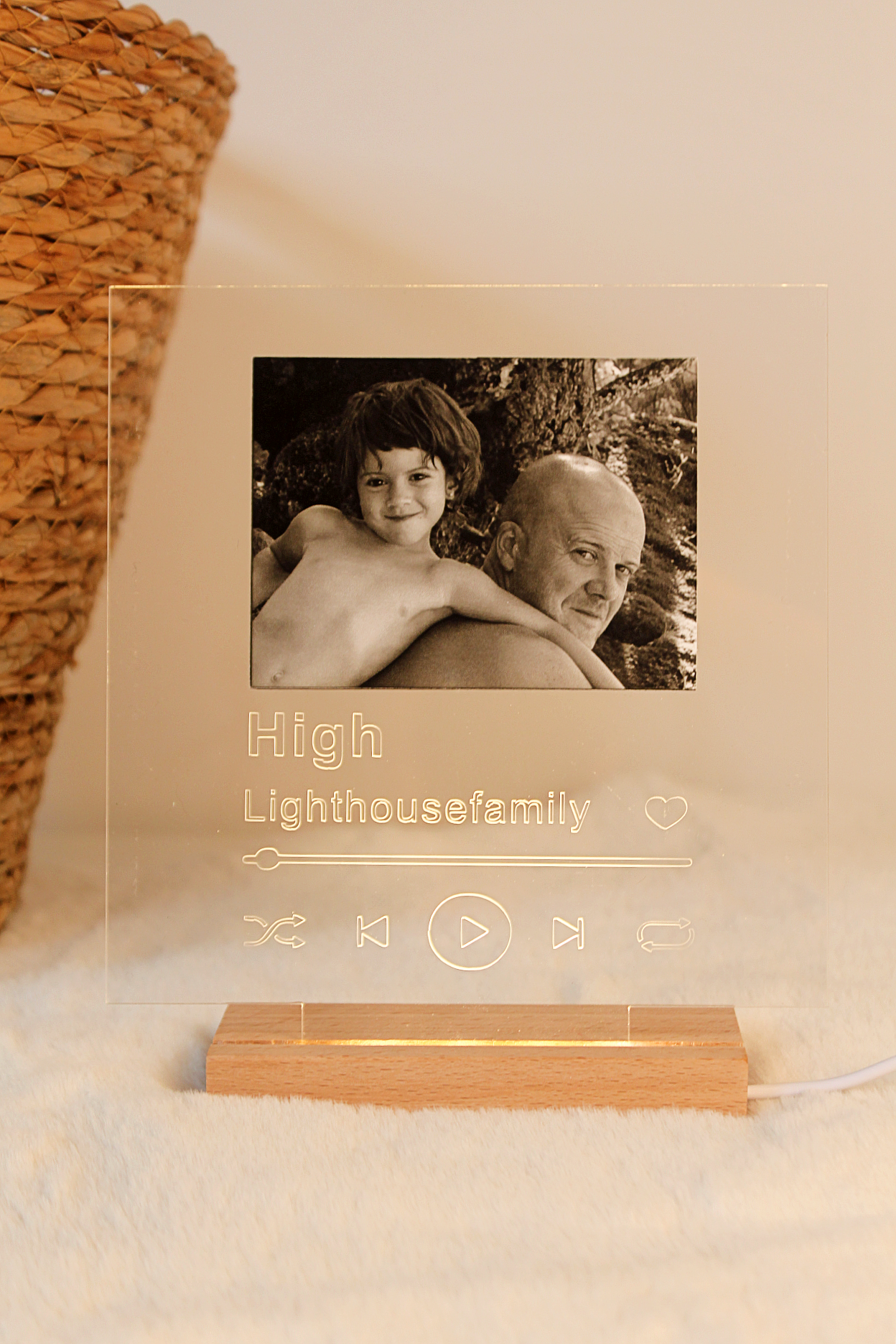 💡 Dato adicional: la imagen no está impresa en la lámpara, sino que se coloca estilo “pegatina”, acompañando el grabado de vuestra canción, que se ilumina con la luz LED de forma cálida y decorativa