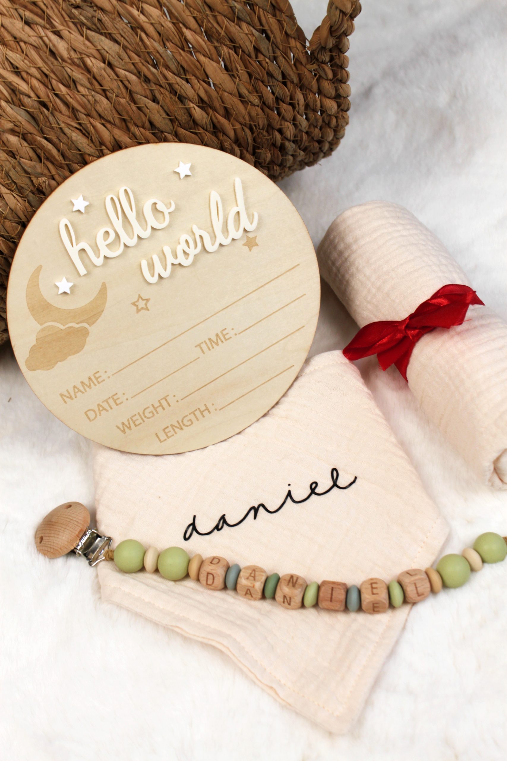 Pack recién nacido personalizado: babero, mini muselina, placa “Hello World” y chupetero. Ideal como regalo de nacimiento o baby shower.