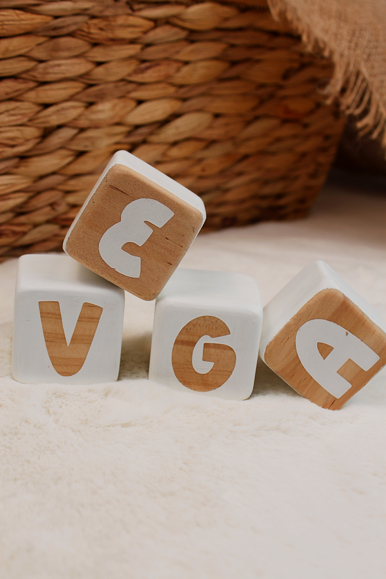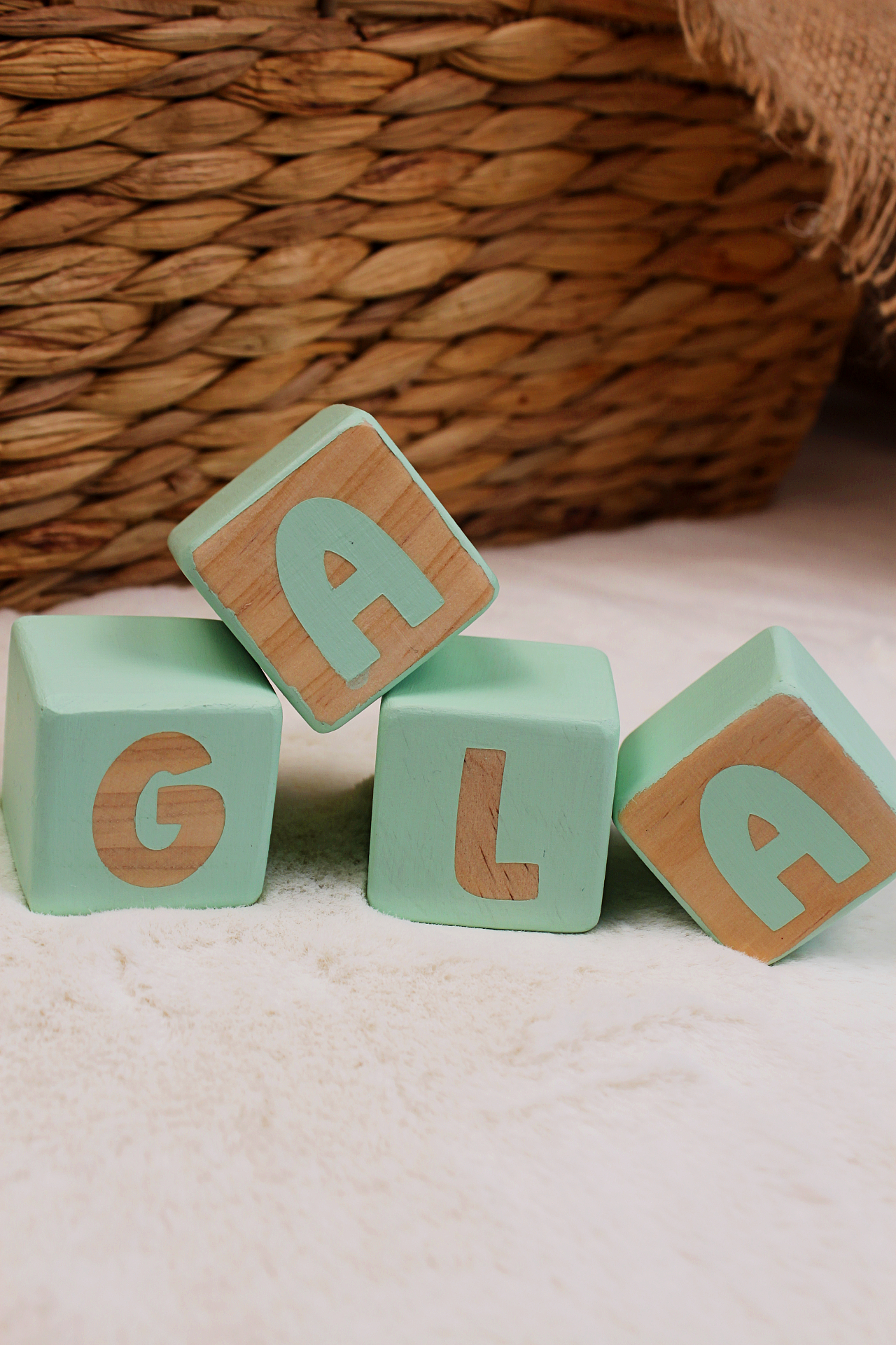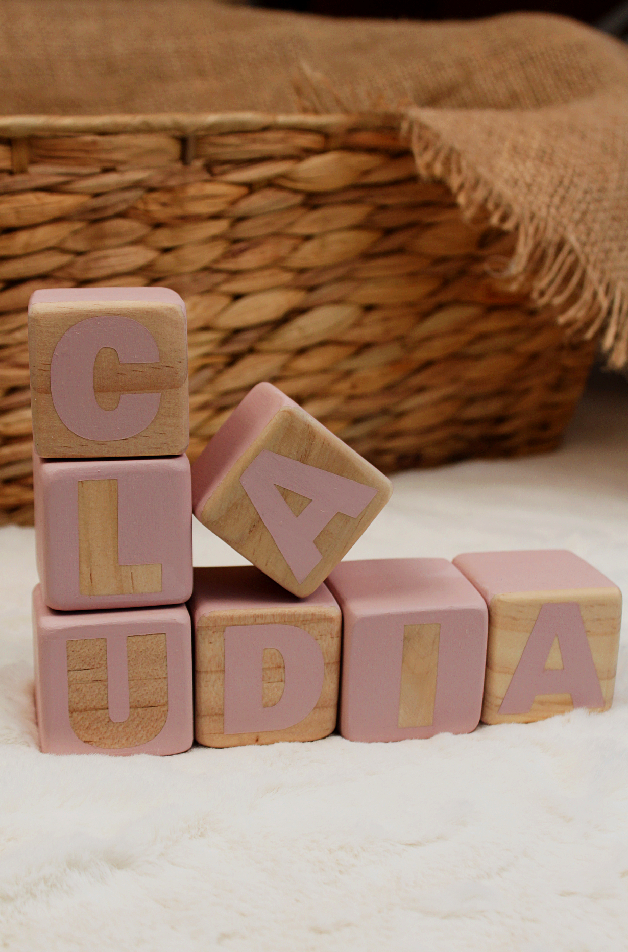 Cada letra del nombre se forma con cubos de madera natural, de unos 4 x 4 cm aprox., cuidadosamente decorados con el color, tipografía y diseño que tú elijas.