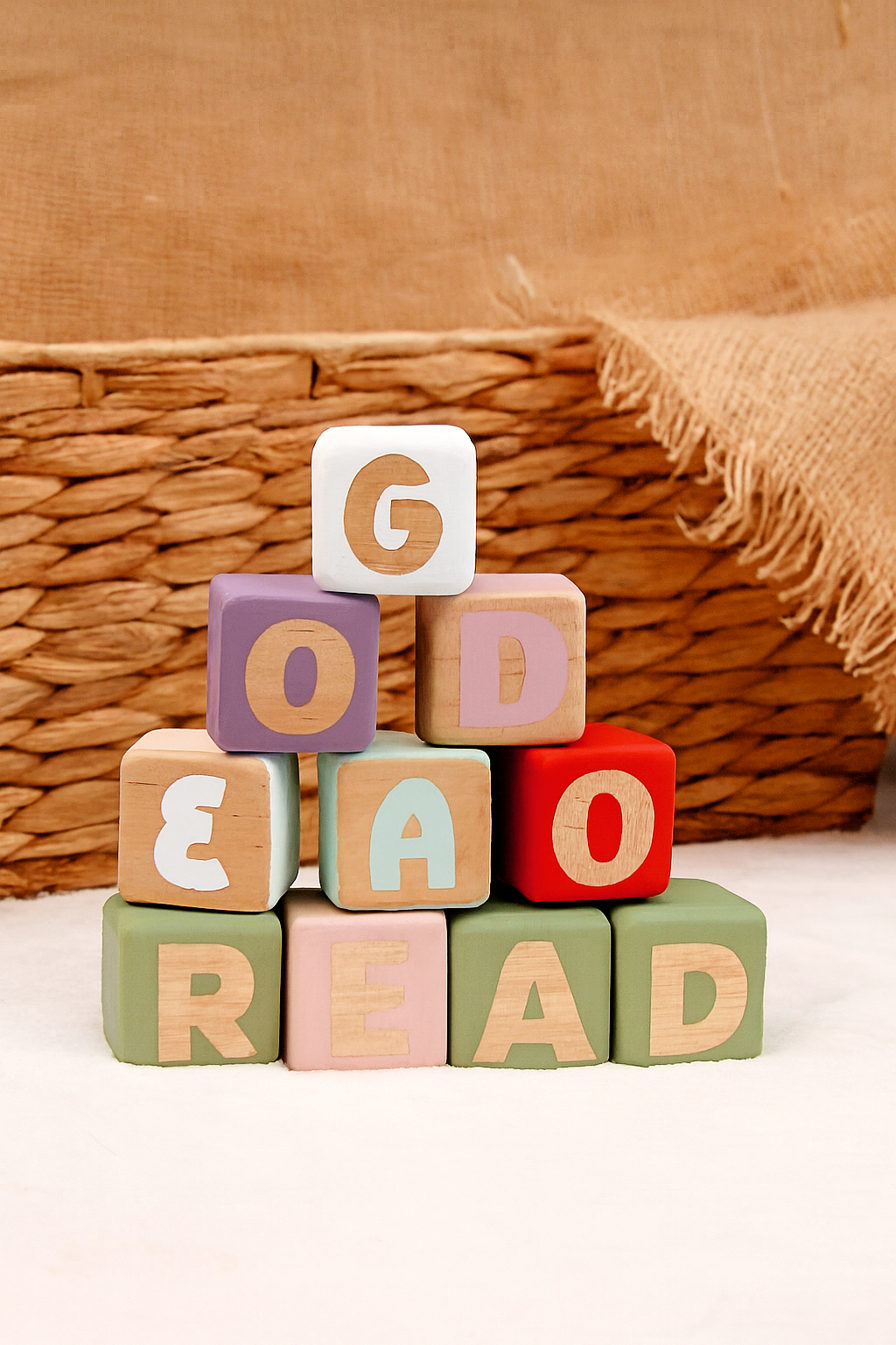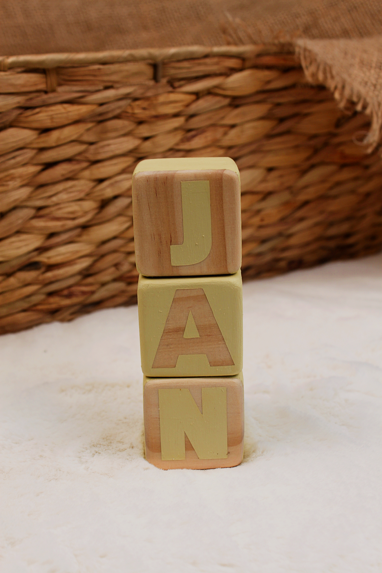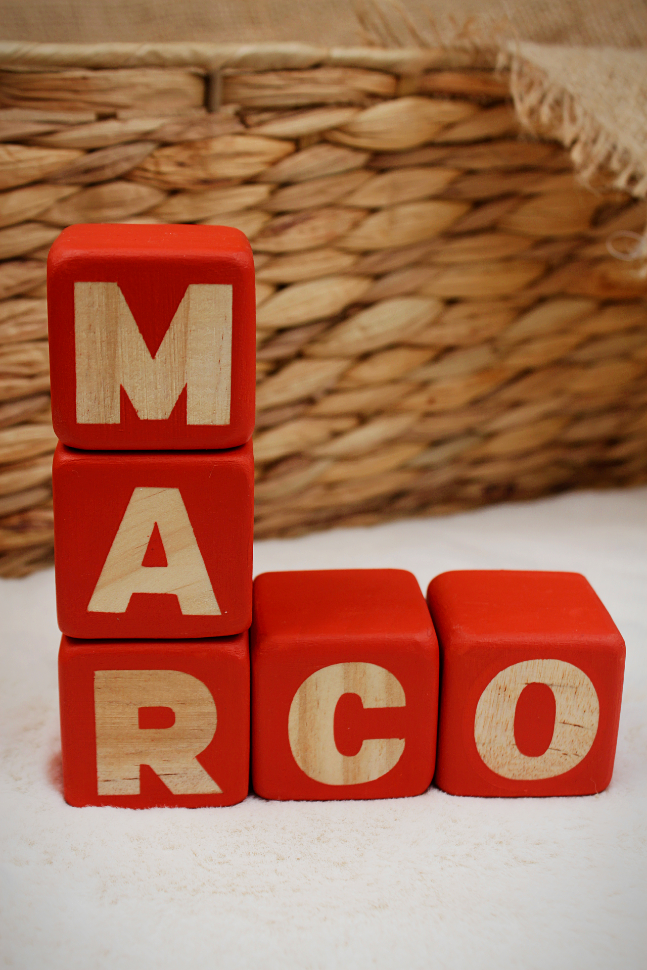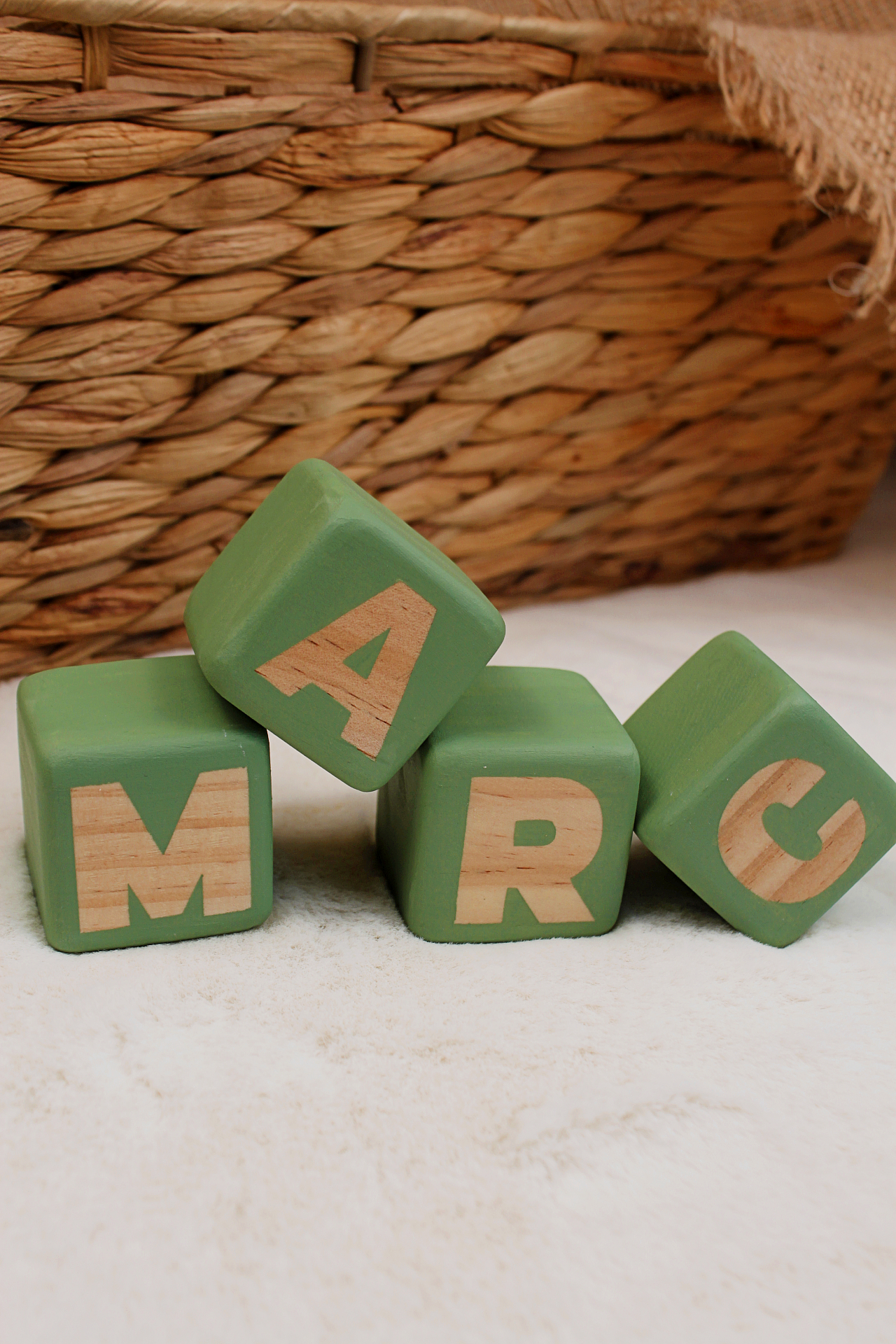 Cada letra del nombre se forma con cubos de madera natural, de unos 4 x 4 cm aprox., cuidadosamente decorados con el color, tipografía y diseño que tú elijas.
