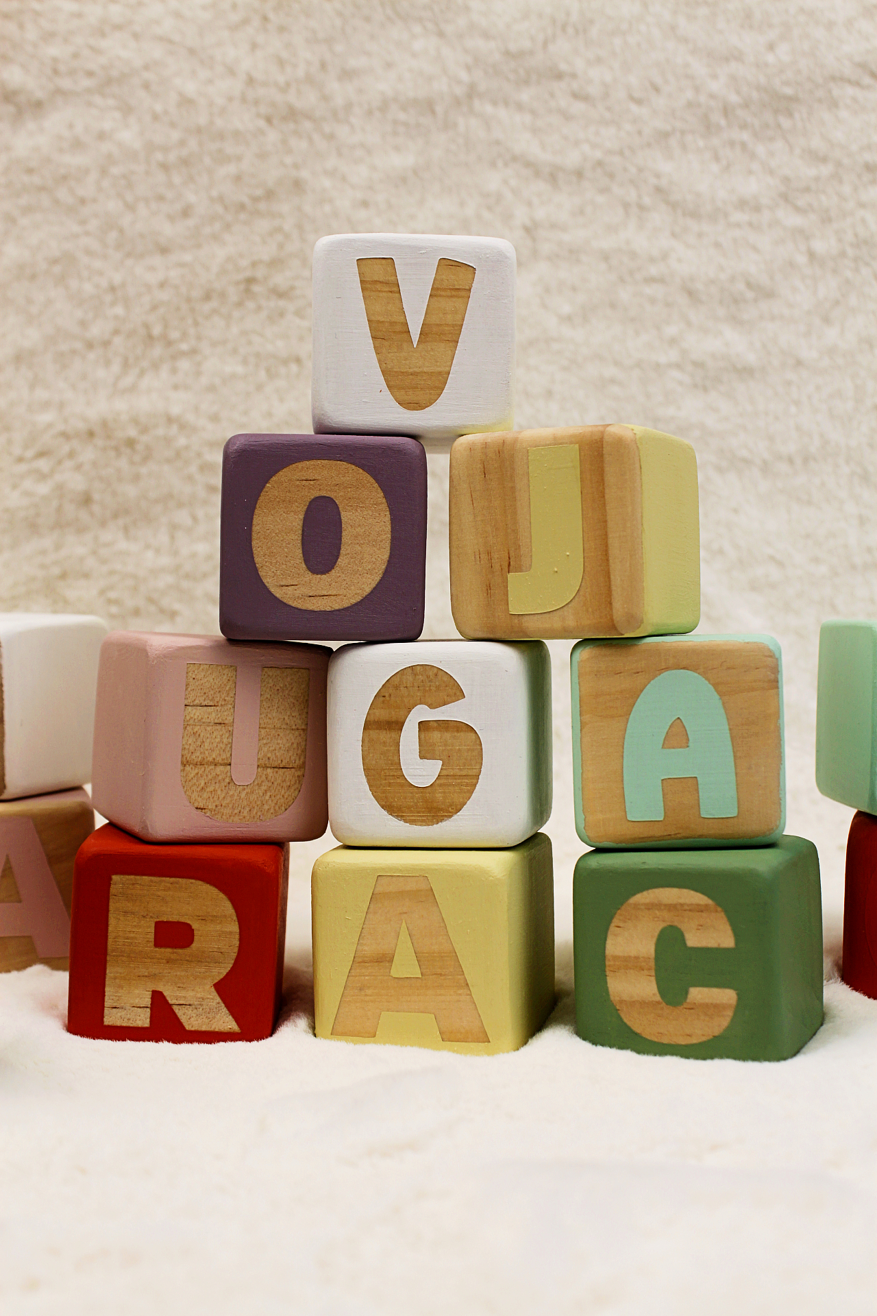 Cubos de madera personalizados con el nombre del bebé o niño. Elige colores, tipografía y caja decorativa. Un detalle único y artesanal para regalar o decorar.