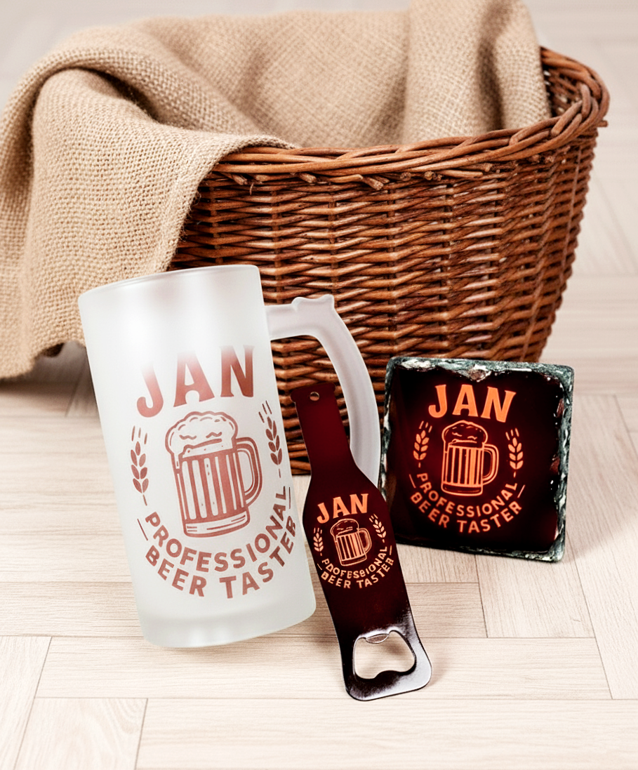 Pack básico de cerveza personalizable: incluye jarra, abridor y posavasos de piedra. Elige entre 6 diseños o crea el tuyo propio. Opcional pack completo con camiseta y tote bag.