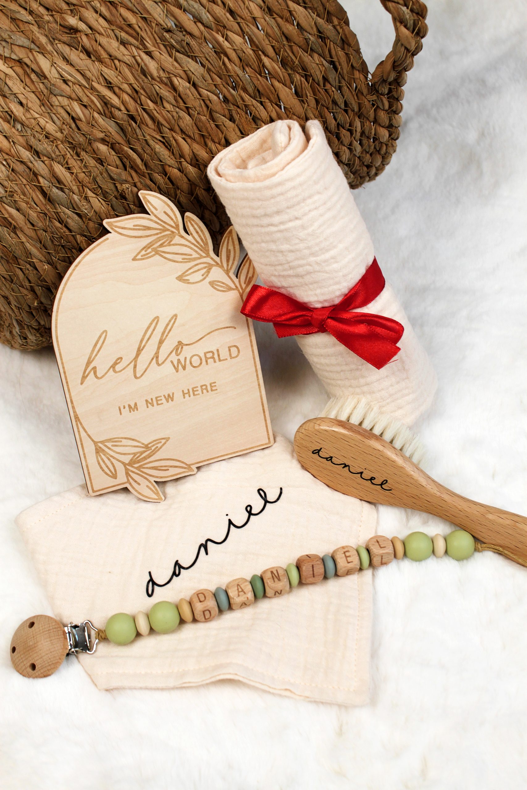 Pack recién nacido personalizado: babero, mini muselina, placa “Hello World”, cepillo y chupetero. Ideal como regalo de nacimiento o baby shower.