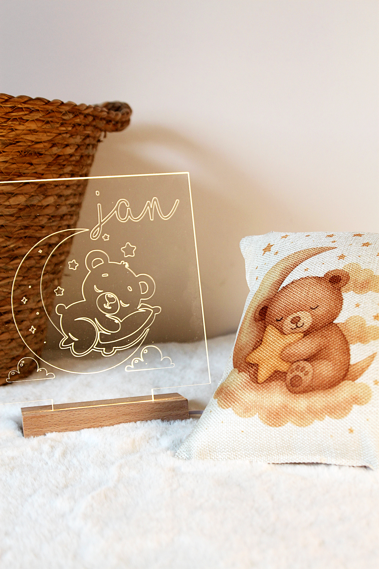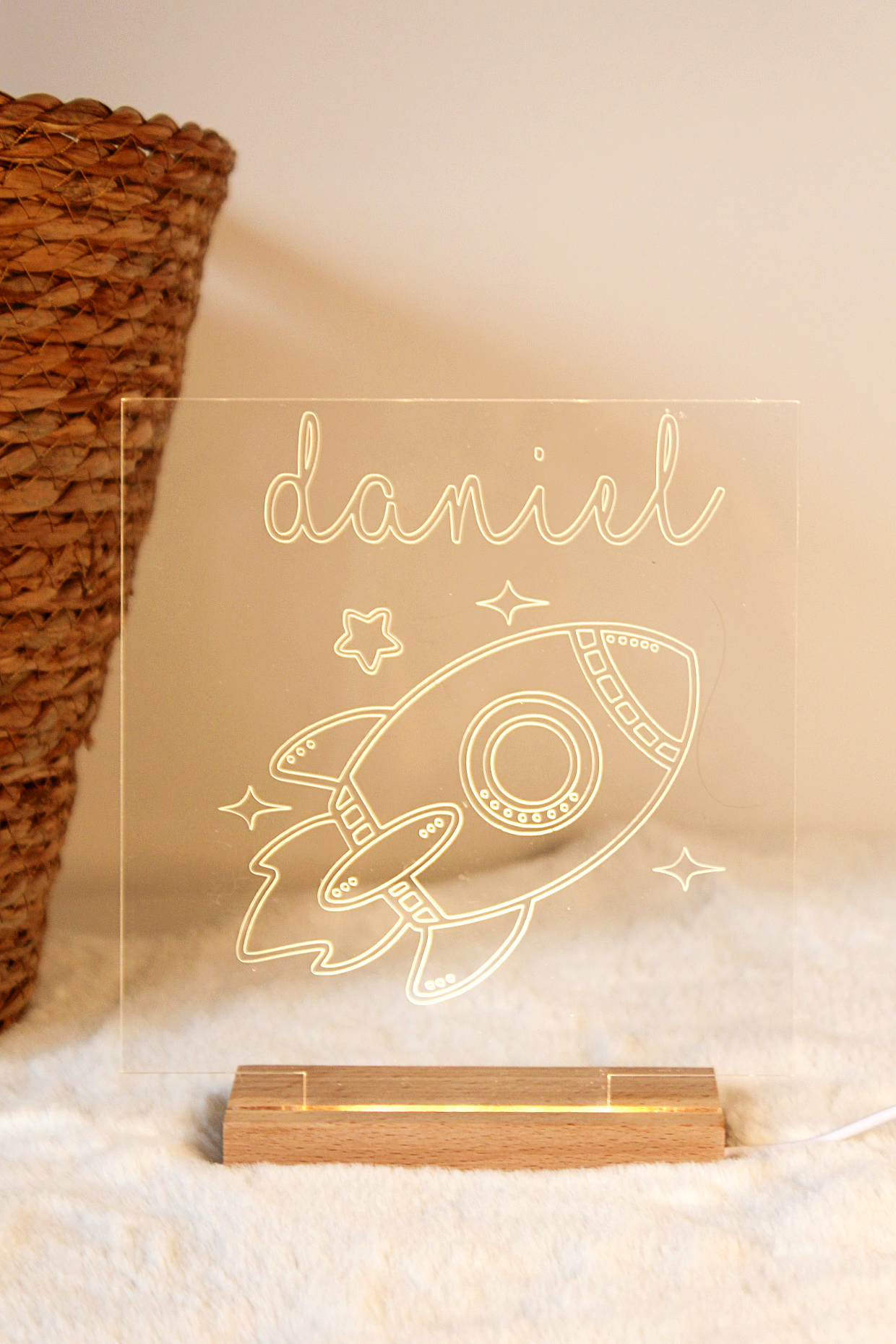 • Lámpara LED personalizada: grabada con el nombre del bebé y el diseño que prefieras. Aporta una luz suave y cálida, perfecta para la habitación infantil.