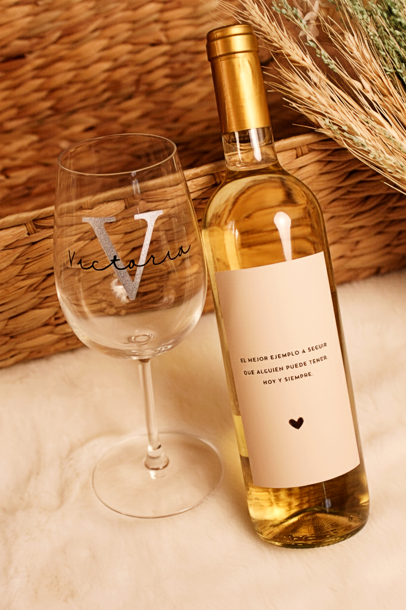 Regala nuestro pack de copa y botella de vino personalizado, el detalle perfecto para Navidad, cumpleaños o amigo invisible.