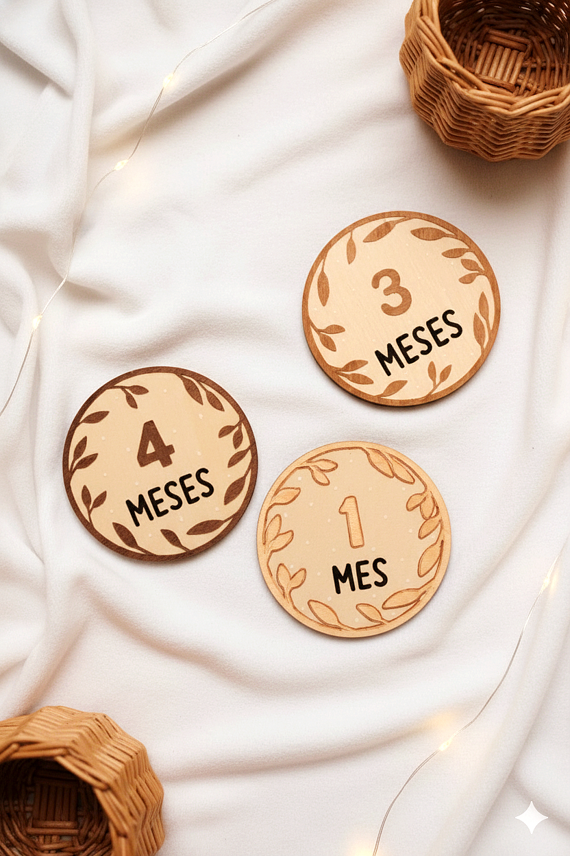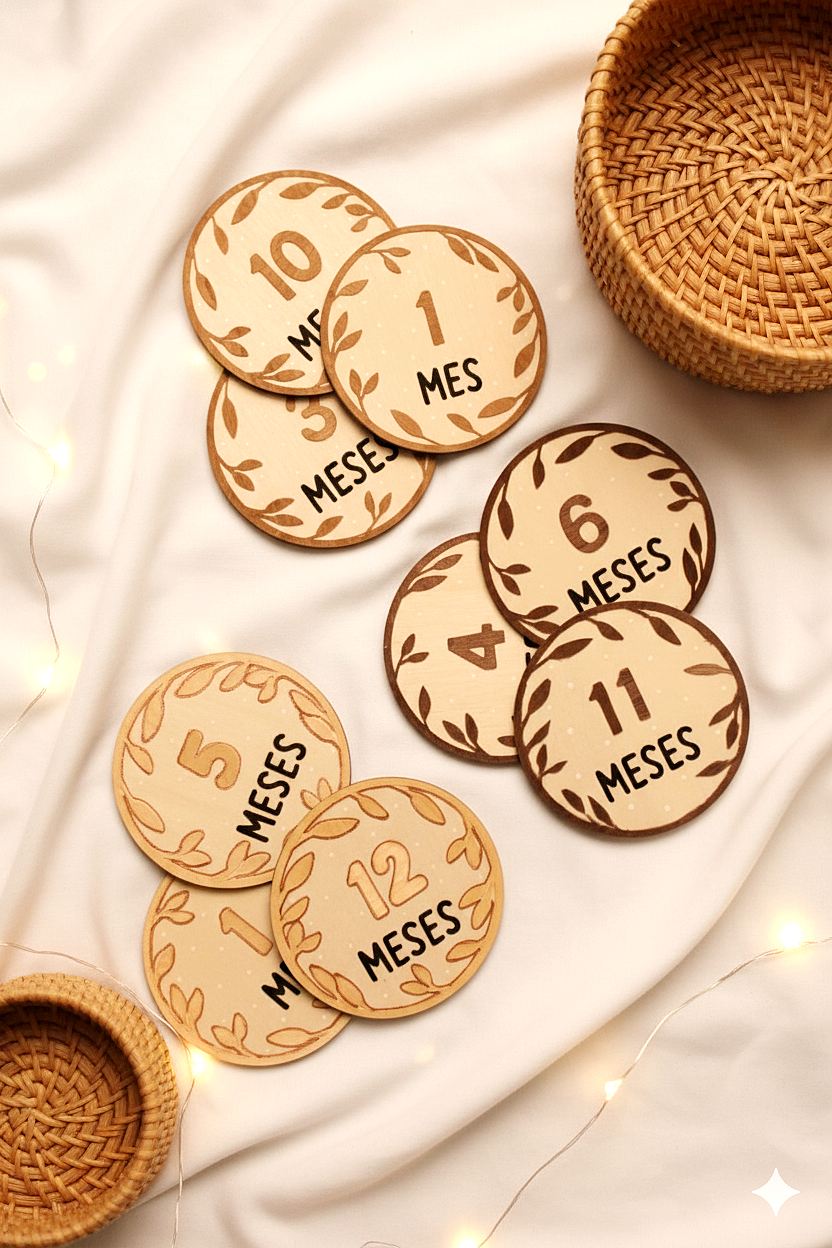Placas “cumple mes” de madera en tres diseños. Captura cada mes del bebé con un detalle tierno y colorido, y complétalo con la cajita personalizable con su nombre, ideal para fotos y recuerdos especiales
